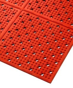 Mata wyposażona jest w otwory drenażowe, które skutecznie odprowadzają ciecz spod maty, co znacząco zwiększa bezpieczeństwo w miejscu pracy. Dzięki temu, w przypadku rozlania cieczy, ryzyko poślizgnięcia się jest znacznie zredukowane.