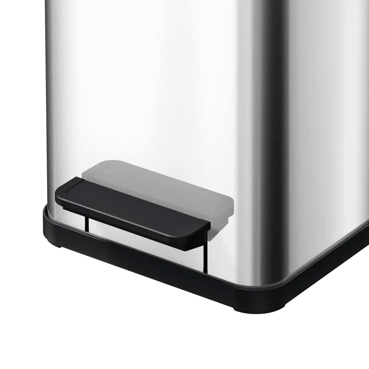 Korpus metalowego kosza na śmieci z mechanizmem nożnym wykonany jest ze stali, a jego powierzchnia jest zabezpieczona przed korozją. Wewnętrzny mechanizm oraz szeroki pedał są wykonane z tworzywa sztucznego, co zapewnia trwałość i wygodę użytkowania. Kosz wyposażony jest w amortyzowany mechanizm, co pozwala na ciche i komfortowe zamykanie pokrywy, dając użytkownikowi wystarczająco dużo czasu na wyrzucenie śmieci.