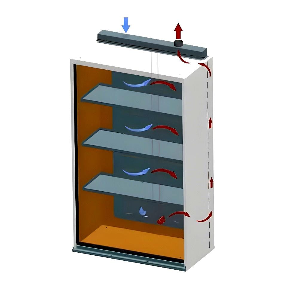 Podczas przechowywania niebezpiecznych cieczy mogą powstawać opary, które tworzą gęstą mieszaninę. Obudowa wyposażona jest w system automatycznej wentylacji bez wymuszonego wiatru, jednak niezbędne jest przyjęcie obowiązkowej efektywnej wentylacji. Górna część szafy jest przygotowana do wyposażenia w wentylację techniczną służącą do odprowadzania wywiewanego powietrza. W przypadku wyposażenia szafy w ten sprzęt do wentylacji wywiewnej, nie jest on już potrzebny; należy zapewnić inne środki w celu wyeliminowania ryzyka burzy i nieczystości. Pozwoli to uprzątnąć i zapobiec wydostawaniu się oparów do powietrza, co może zagrozić zdrowiu pracowników. |