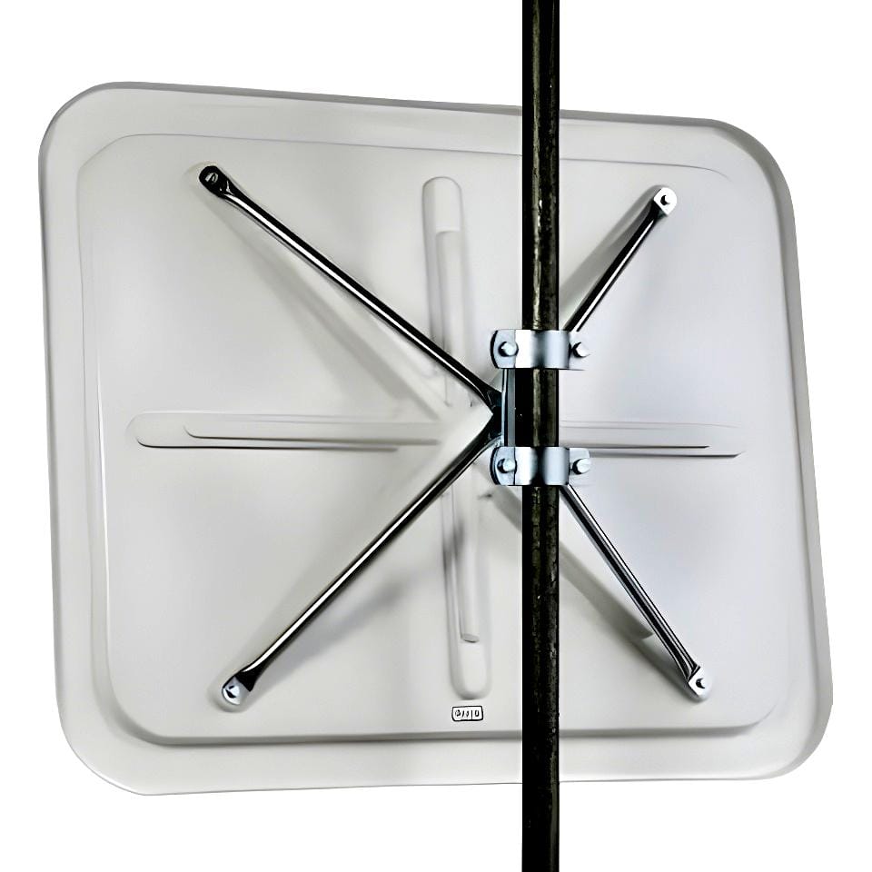 Lustro jest dostarczane w zestawie z czteroramiennym przegubowym uchwytem, który umożliwia montaż na ścianie lub rurze o średnicy od 50 do 85 mm. To mocne mocowanie jest odporne na wiatr o prędkości do 12 stopni w skali Beauforta (117 km/h), co zapewnia stabilność i bezpieczeństwo użytkowania.